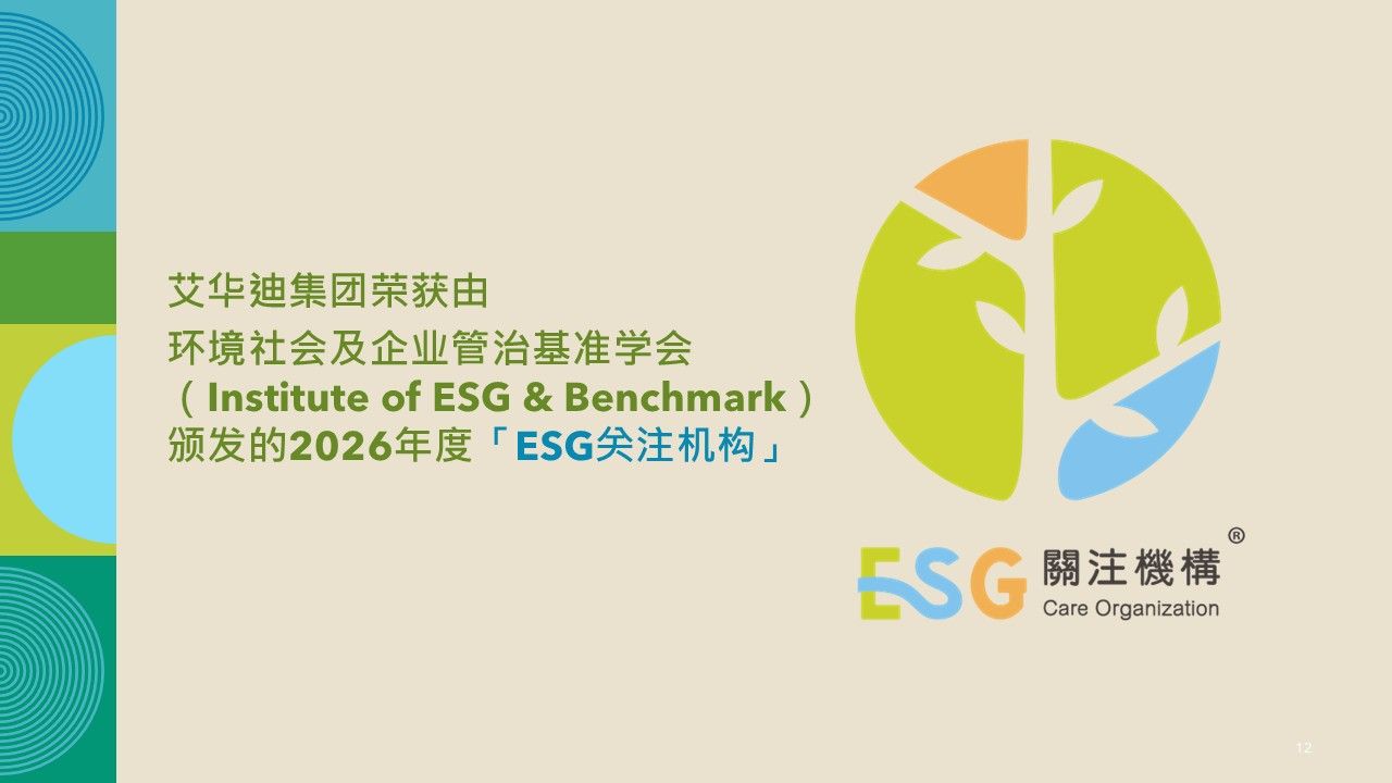 艾華迪集團榮獲國際權威機構環境社會及企業管治基準學會(Institute of ESG & Benchmark,簡稱IESGB)頒發的“2026年度ESG關注企業” 嘉許。這是對我們在環境、社會及管治(ESG)領域持續追求卓越的高度肯定,更是我們踐行可持續商業與社會責任的又一重要里程碑。