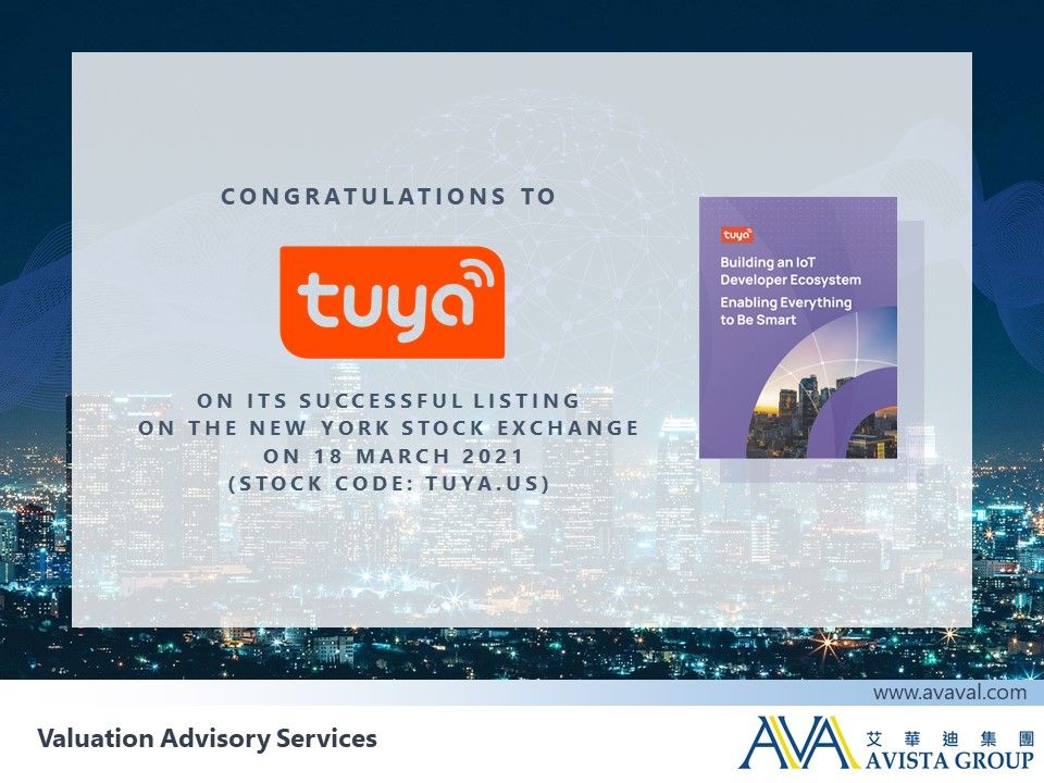 Congratulations to Tuya Inc. (stock code: TUYA.US) on its successful listing on NYSE on 18 Mar 2021. With regard to this listing application, AVISTA Group is honored to be engaged in providing financial instruments valuation services.