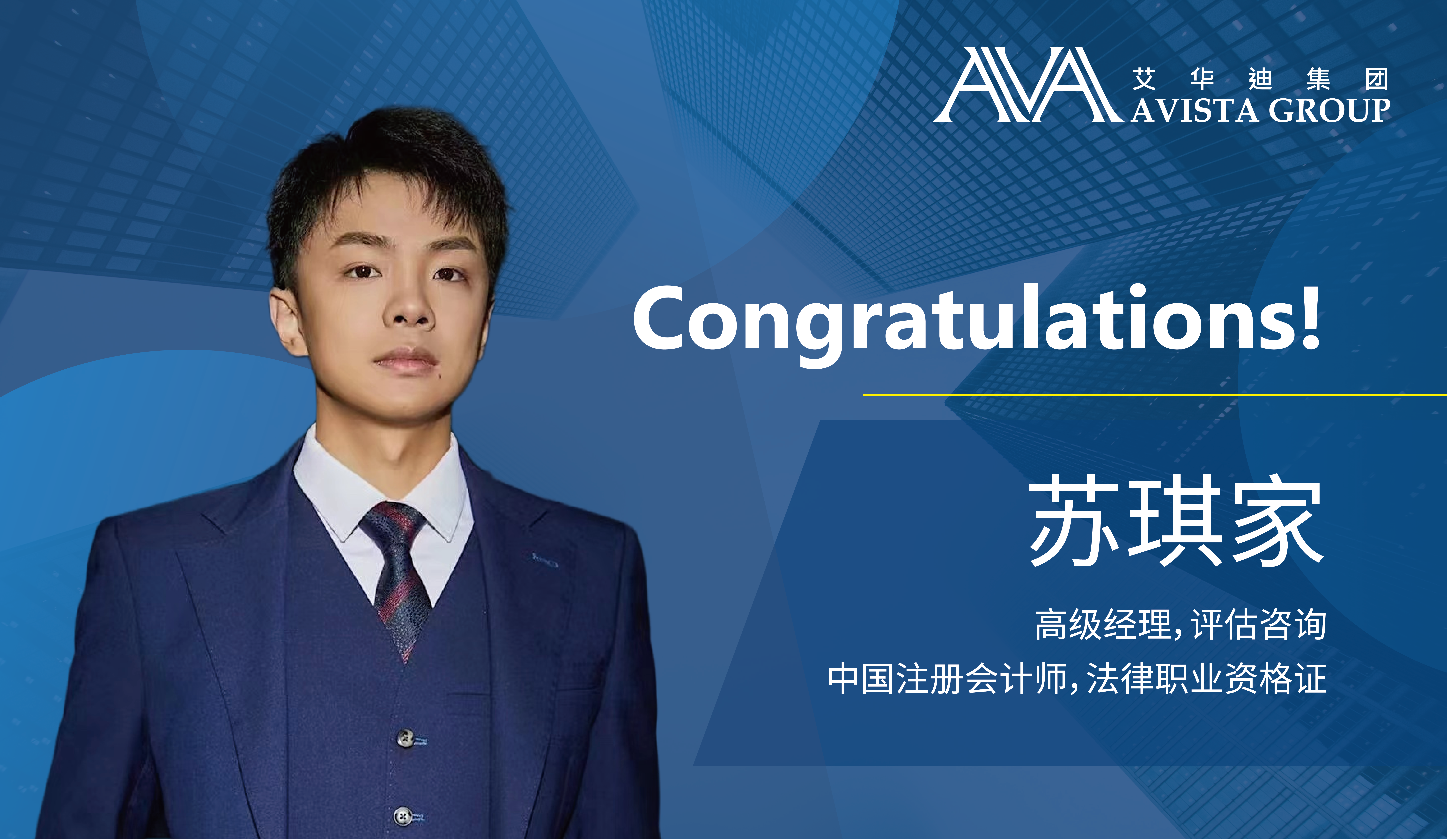 艾华迪集团在此恭贺苏琪家先生晋升并担任上海办事处商业评估咨询部高级经理职务