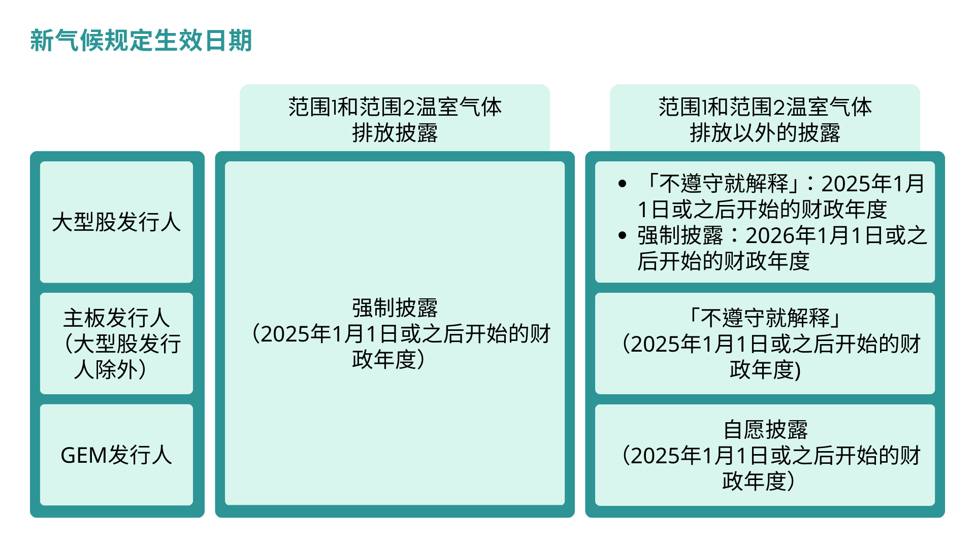 新氣候規定是依據IFRS S2制定,提供實施寬免,包括按比例及分段擴展措施,以因應部分發行人可能面對報告的挑戰。